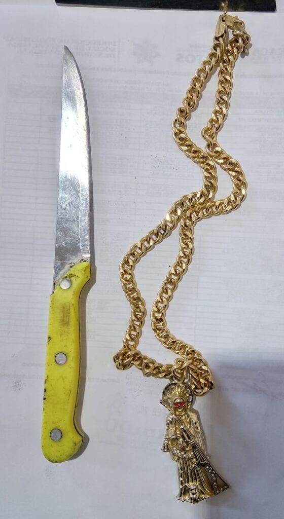 Los elementos actuaron de inmediato y controlaron al sujeto, quien en la mano izquierda portaba un cuchillo y en la mano derecha, la cadena que había arrebatado.