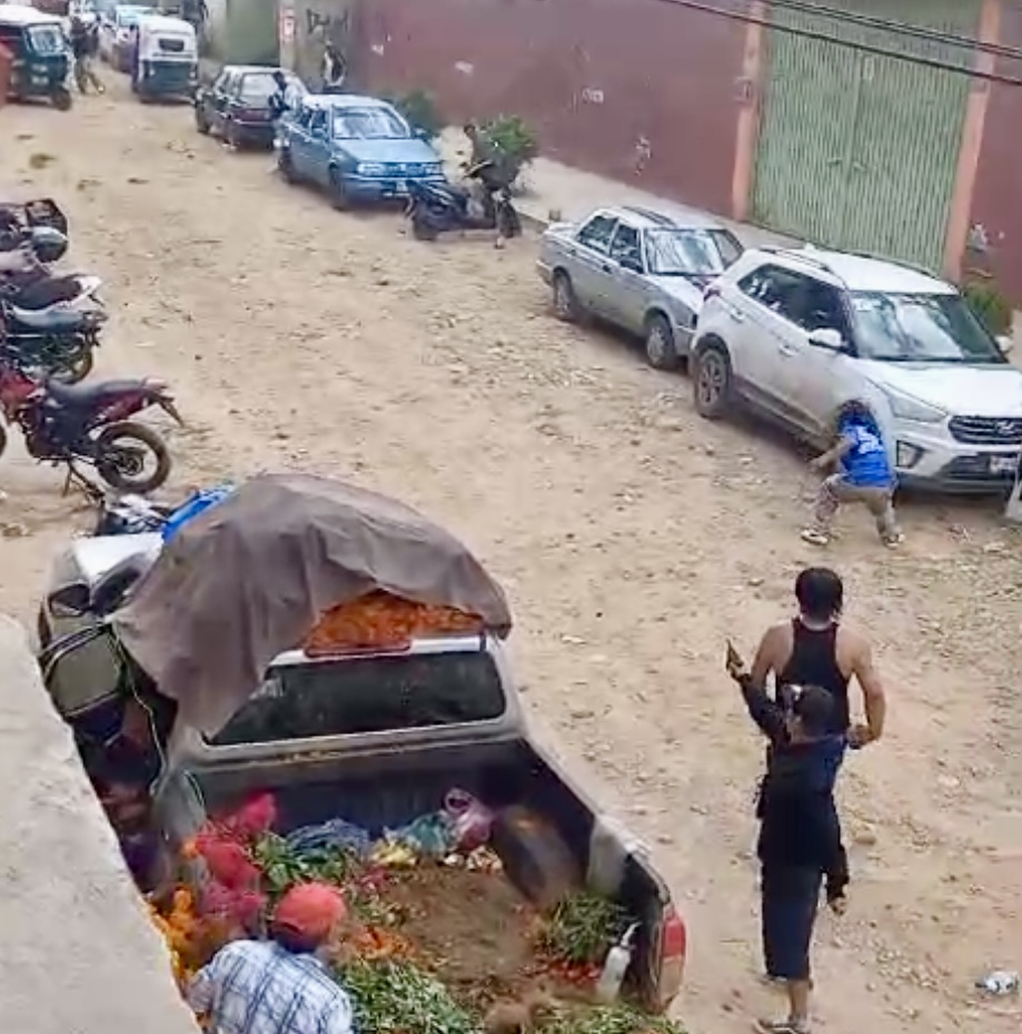 Esta tarde se registró un enfrentamiento entre dos diferentes grupos de “cholos”, en el panteón de la Agencia Municipal San Martín Mexicapam en la capital oaxaqueña. La riña comenzó en el interior del camposanto, al parecer entre presuntos líderes de cada bando, todo quedó grabado por unos vecinos que desde el balcón de su casa captaba todos los detalles con su teléfono celular, en las imágenes se observa la pelea entre los dos sujetos, rodeados por integrantes de ambos grupos intentando intervenir, mientras que una mujer impide que alguien interfiera. Al verse derrotado, el sujeto de blanco sale del panteón para continuar la riña, pero ahora con el apoyo de sus compañeros, sin embargo uno de los adversarios sacó una arma de fuego accionándola en varias ocasiones; en respuesta el sujeto de blanco también dispara una pistola que al parecer después se atascó, mientras tanto, una familia con una persona en muletas, quedó atrapada en el fuego cruzado, resguardándose entre los autos estacionados.