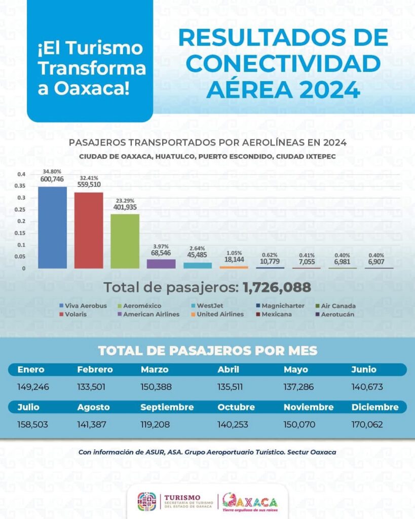 La exedil de San Pedro Pochutla explicó que 1,726,088 visitantes llegaron a Oaxaca vía aérea durante 2024, una cifra récord que beneficia directamente a los habitantes de la región.