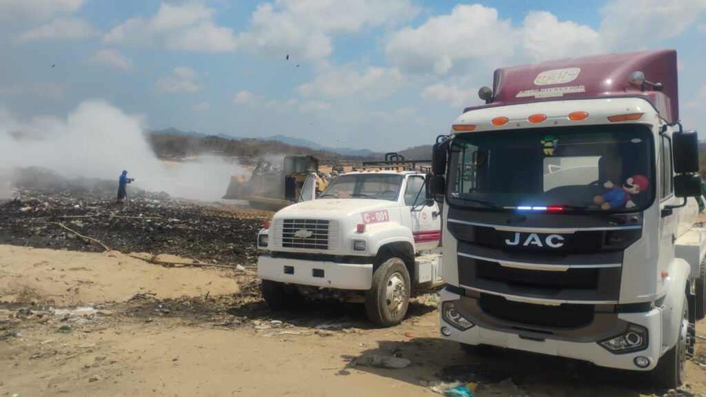 Por indicaciones del director de la Comisión Estatal del Agua para el Bienestar (Ceabien), Neftalí Amigdael López Hernández, personal del organismo apoya con pipas de agua para combatir el incendio en el basurero perteneciente al municipio de San Pedro Mixtepec, en la Costa de Oaxaca.