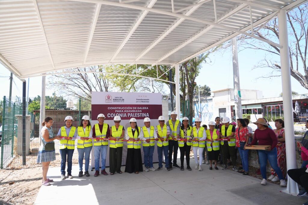 En esta jornada, se entregó en la colonia Símbolos Patrios la pavimentación de adoquín en la calle Himno Nacional Mexicano, así como la construcción de la galera para asambleas en la colonia Palestina, un espacio diseñado para el encuentro y la organización vecinal.